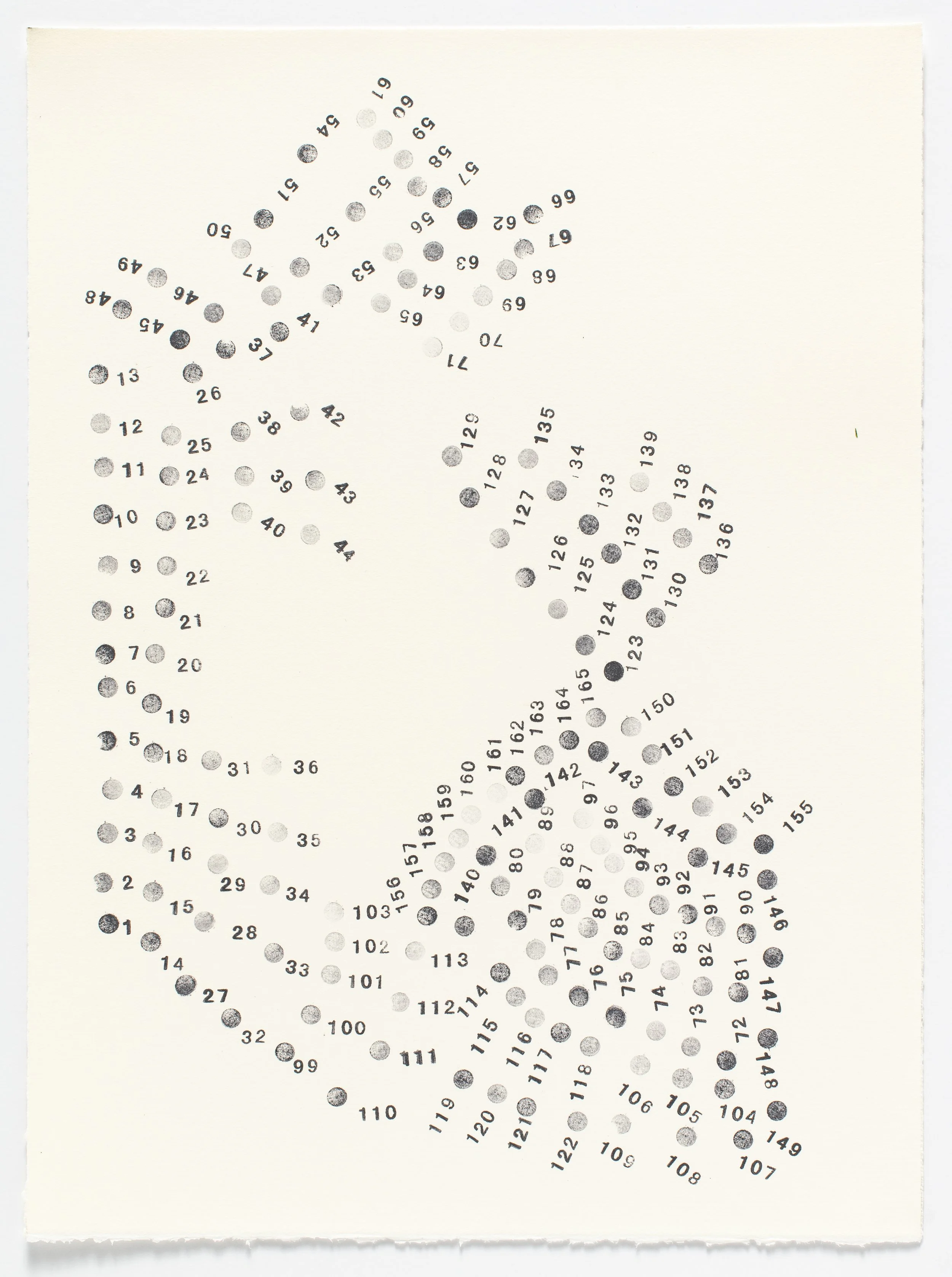 I create compositions mimicking connect the dot worksheets for children that, when connected, produce no recognizable forms. Sometimes the enumerated dots fill the page and sometimes the works are made up of sparse groupings of dots. Connect the dots sheets are used to train a child’s fine motor skills, and to produce the moment of excitement when the final form is revealed from previously unreadable arrangement of dots. By using the framework to produce something meaningless, I’m foregrounding the specific structure of meaning-making itself as well as the viewer’s desire and even ability to find recognizable form regardless of my intention.